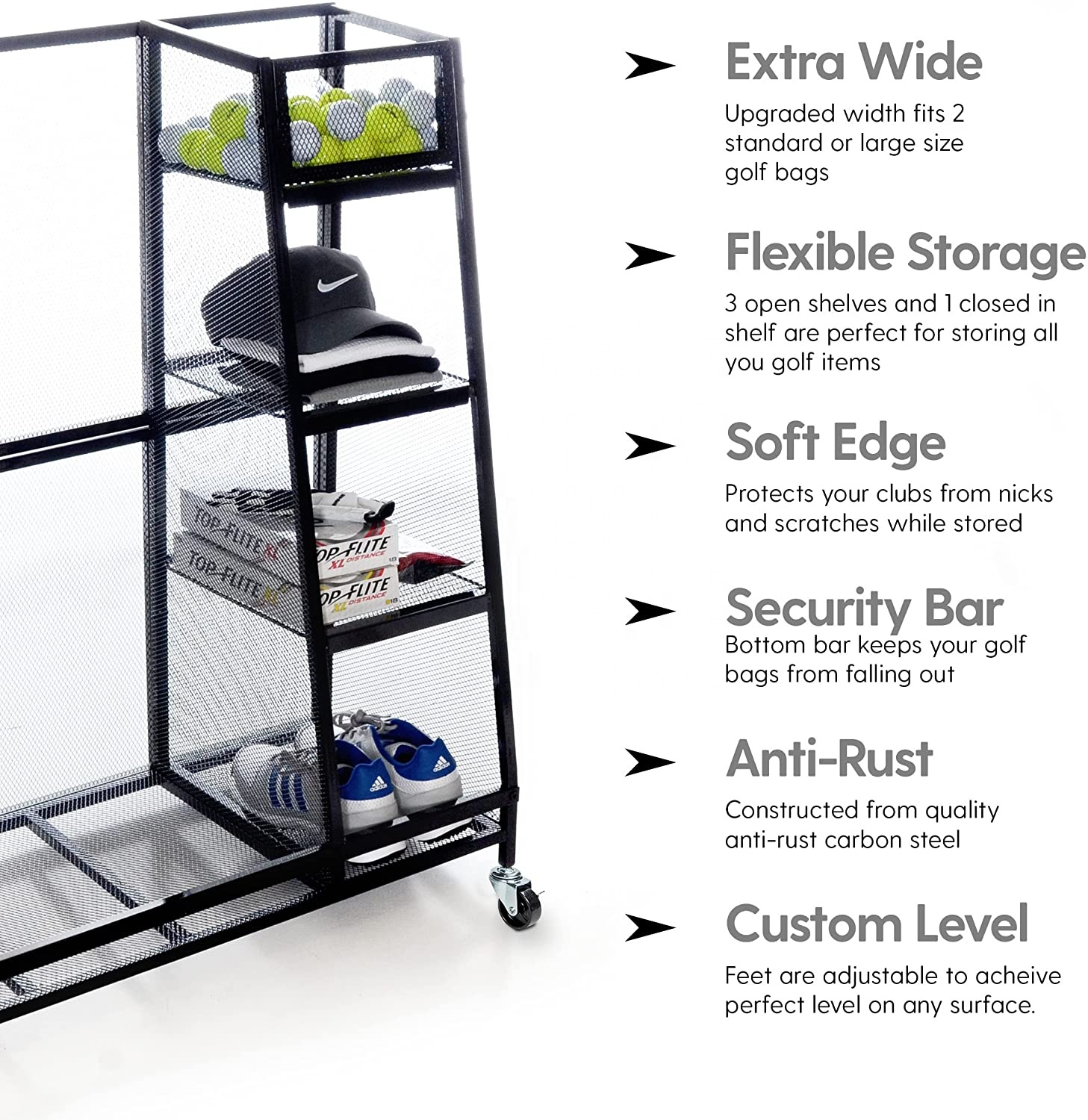 * Extra Roomy - main compartment has been upgraded to 26 inches long to fit 2 standard or large size golf bags! 3 open shelves for your medium sized gear, and 1 closed in shelf for your small loose items.