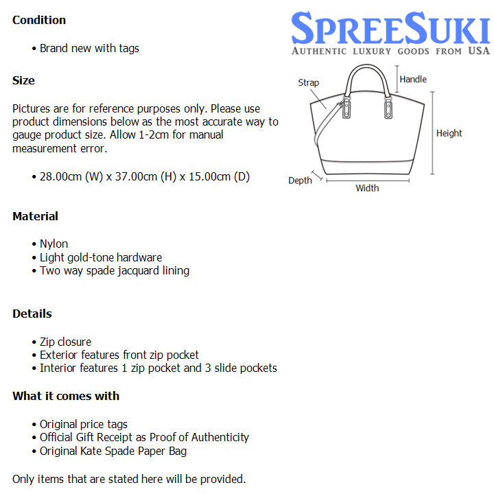 All our products are 100% authentic and purchased from Kate Spade stores in USA. We are a reputable registered business in Singapore and it is illegal to sell counterfeit goods in Singapore. This product also comes with a gift receipt which is printed by the Kate Spade store that we purchased the item from. It states the item that we purchased and the Kate Spade store that it was purchased from, proving the authenticity of the item. Buy with confidence.