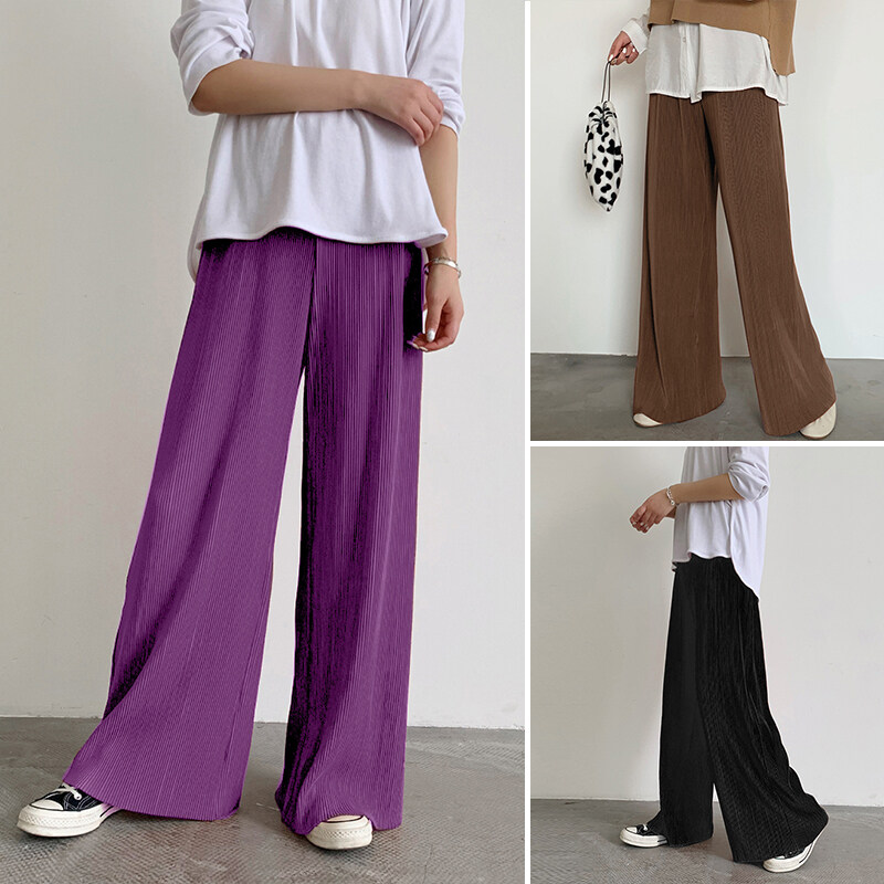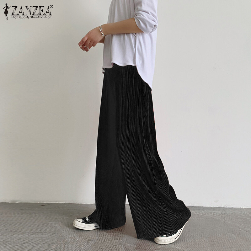 ZANZEA Korean Style Womens Elastic Waist Casual Long Pants Wide Leg Pleated Trousers