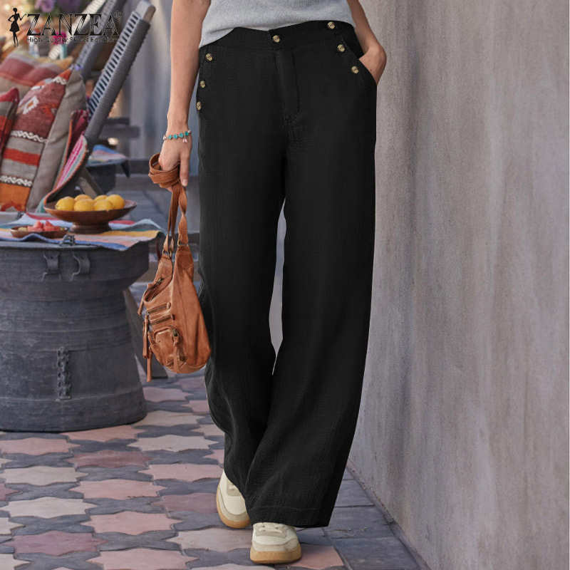 ZANZEA Women's Vintage Simple Wide Leg Solid Trousers Casual Cotton Loose Straight Long Pants #15