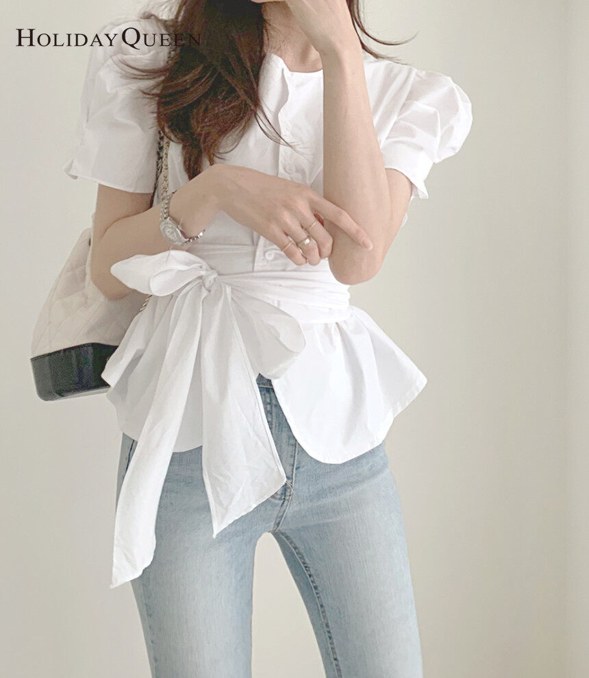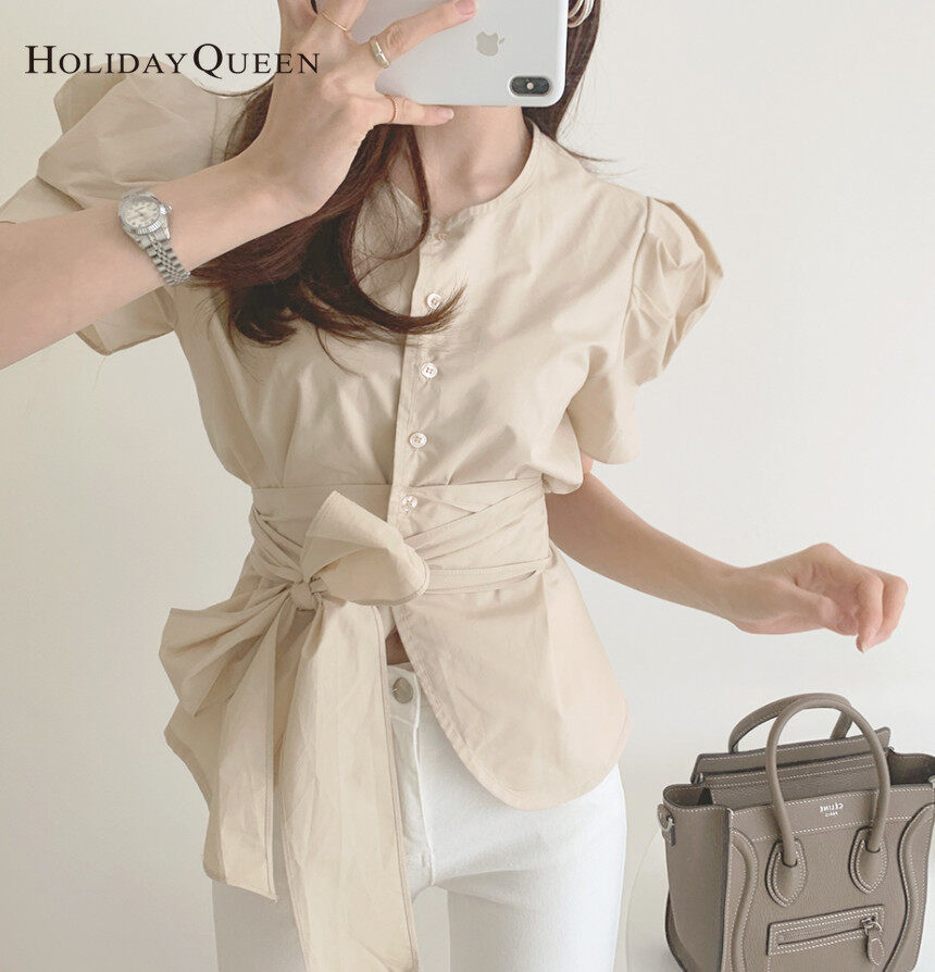 HolidayQueen Summer Puff Sleeve Tie Waist Waist Thin Chic Short Sleeve Shirt S M Free Shipping HQ0436