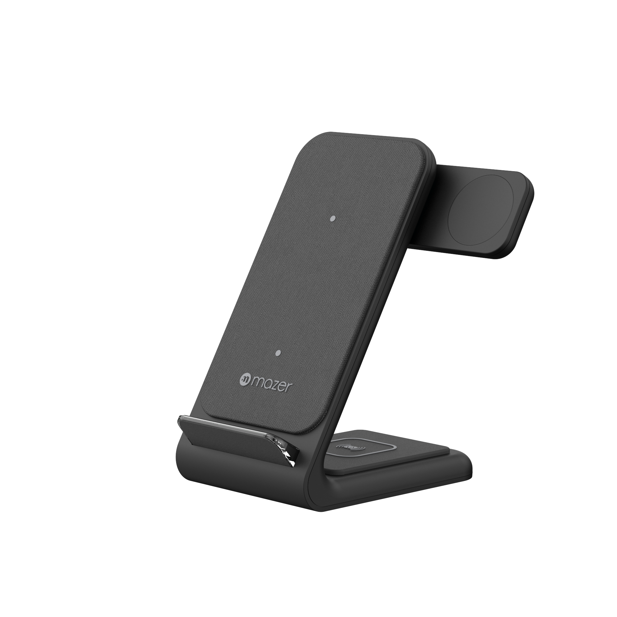 Mazer Wi.DESK SWING-V2 3-in-1 Wireless desktop charger with Special Design of Cooling System&Finished with Premium Fabric Design.Wireless charging stand that rejuvenates three devices at once. Slim and sleek, with a small footprint that takes up minimal space on a desk or nightstand.Save space and charge 3 devices wirelessly at the same time with the smarter wireless charging stand, Mazer Wi.DESK SWING-V2.Dedicated wireless charging stations for wireless phones, AirPods, and a swing-out charging arm for Apple Watch makes Wi.DESK SWING-V2 the perfect desk mate. And for even more convenience and easy use, three indicator lights illuminate to confirm charging, then turn off thirty seconds later.Wil.DESK SWING-V2 is the smarter way to wirelessly charge your favourite devices.Charges 3 devices at once: phone, AirPods/AirPods Pro and Apple Watch (all series) Qi certified to work with Qi enabled devicesPlugs into power with a USB-C to USB-C cable (1.5m cable included) Swing arm allows Apple Watch face to be visible in nightstand mode while charging Compatible with AirPods in wireless charging case Compatible with most phone cases (non-metal) up to 5mm thick
