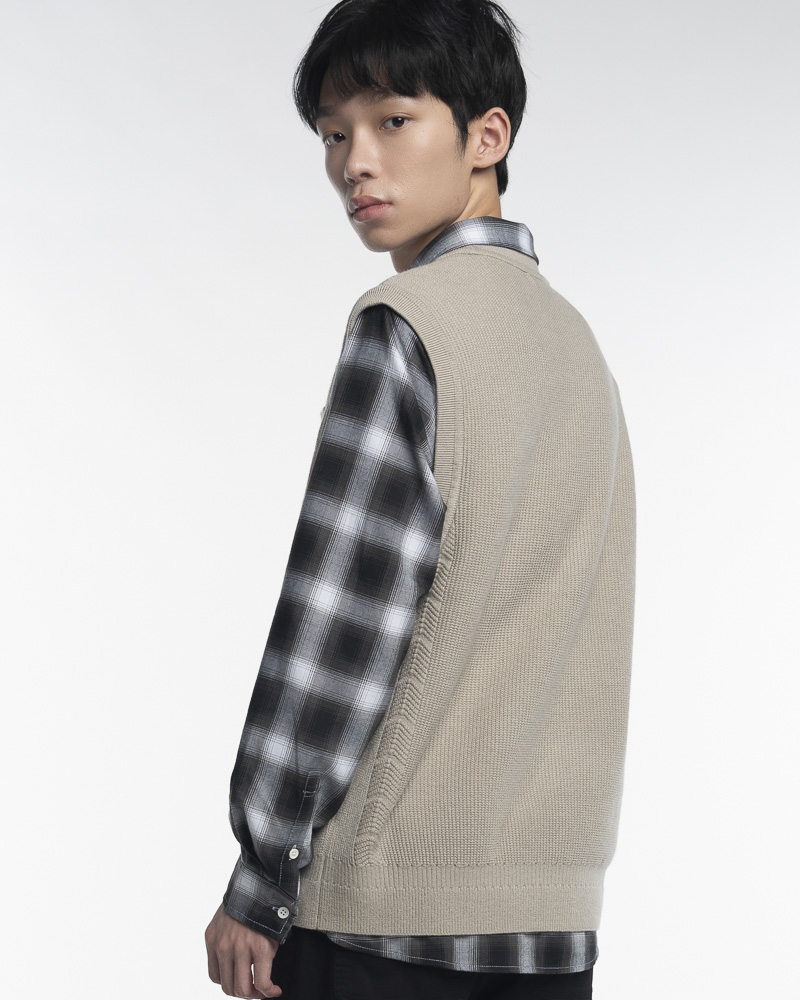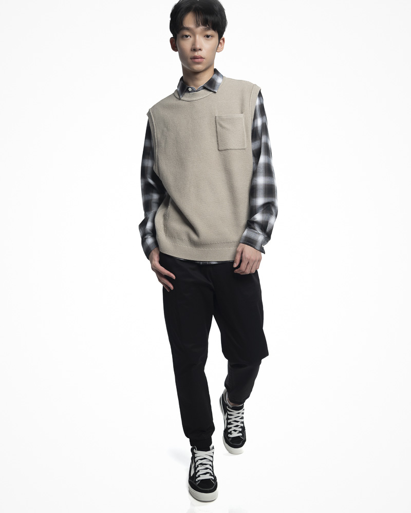 Yishion Men Knitted Round Neck Vest with Chest Pocket and Ribbed Hem (Khaki Beige)